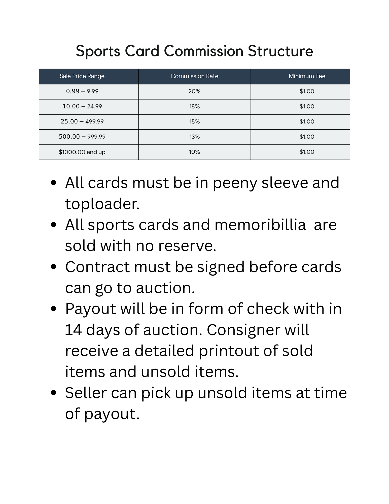 We are now accepting consignments for our upcoming sports card and sports memorabilia auction. Our select auction seeks both ultra-modern and vintage items from collectors and enthusiasts. By consigning with us, you'll benefit from our national marketing platform that will expose your valuable assets to a broad, targeted market. Instead of selling independently, leverage our expertise and reach to maximize the potential value of your sports memorabilia. Consign now and let our professional team showcase your collection to passionate collectors across the country. Jacob Force, our lead consignment auctioneer, brings extensive expertise in sports cards and memorabilia to our auction, ensuring knowledgeable and professional representation of your valuable collectibles. Read on to learn more about our Commission Structures and learn more about our Sports Card & Memorabilia Auctions. When you're ready to dive in, give Jacob a call @ 423-430-7042 or email him at jacobforce@gmail.com to learn more!